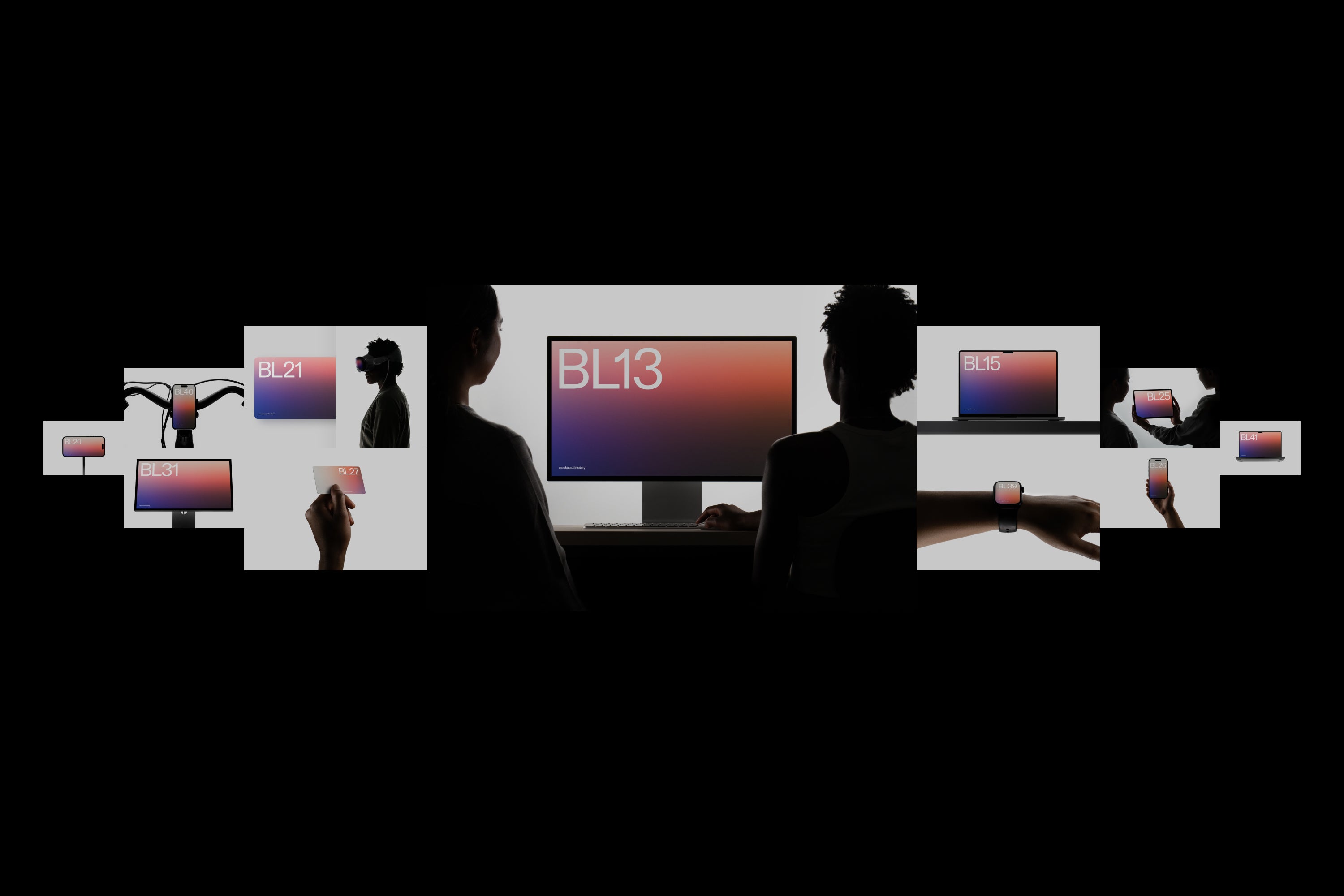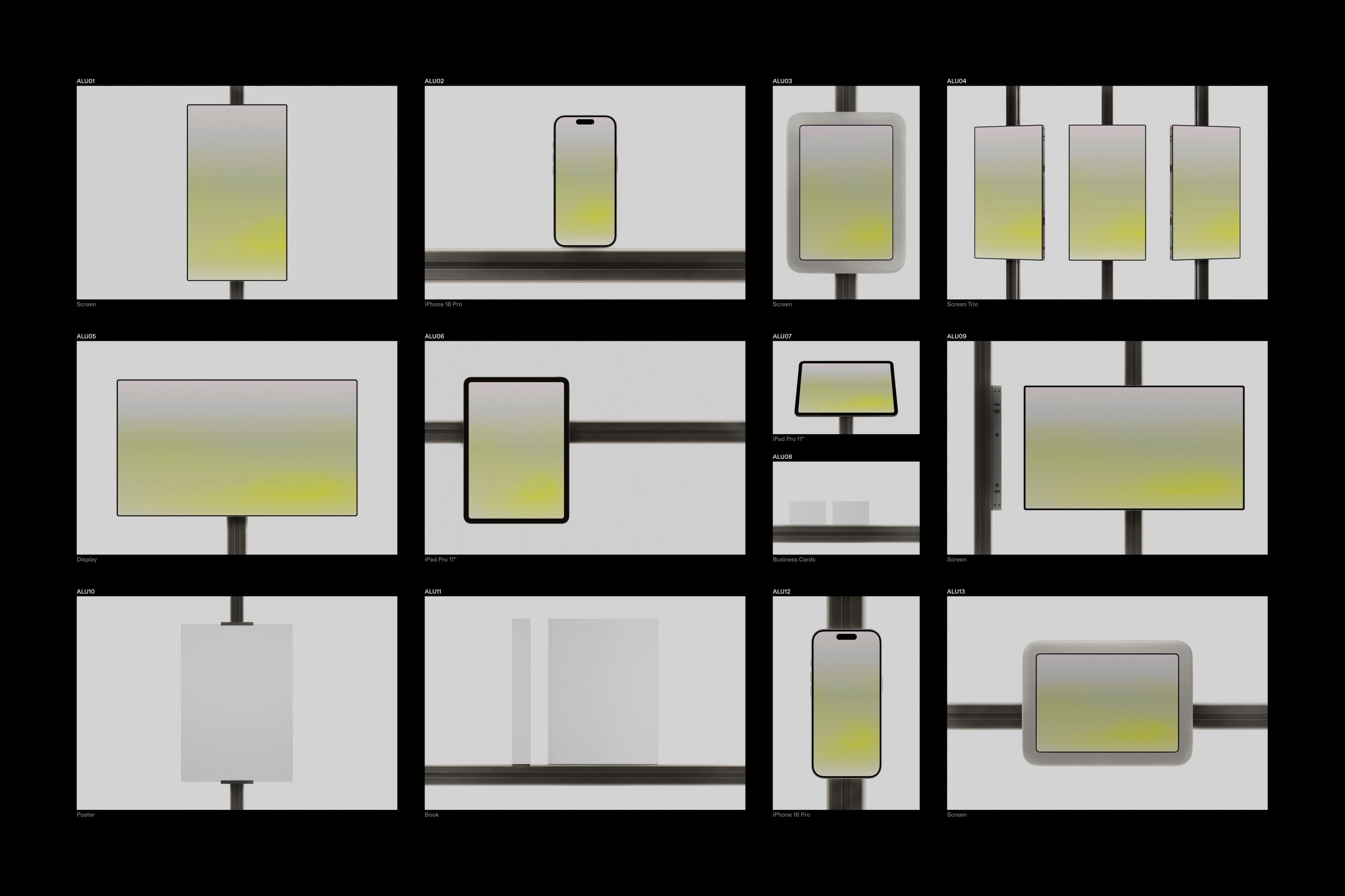This collection includes 13 mockups featuring devices and paper mounted on aluminium profiles, developed with Ben Levinas. Technical, clean, and graphical. From €125.